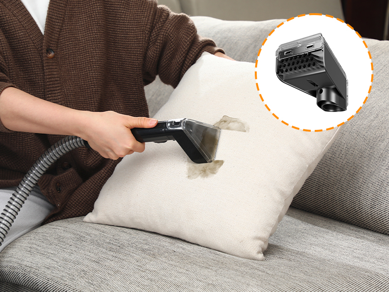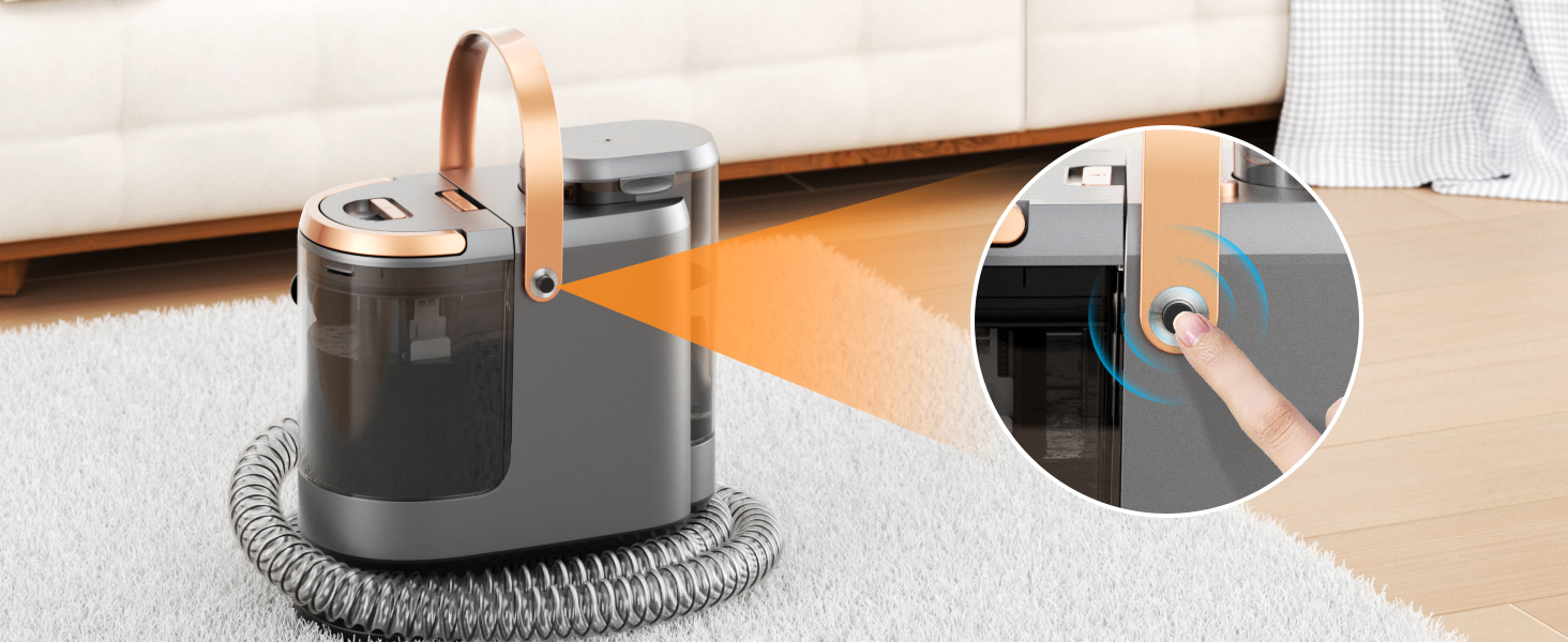 Pulvérisation ciblée sur les taches grâce à une commande pratique à touche unique. Appuyez simplement sur la touche, pulvérisez l'eau, puis nettoyez en profondeur avec la fonction shampouineuse - soins textiles professionnels, d'une simplicité extrême.