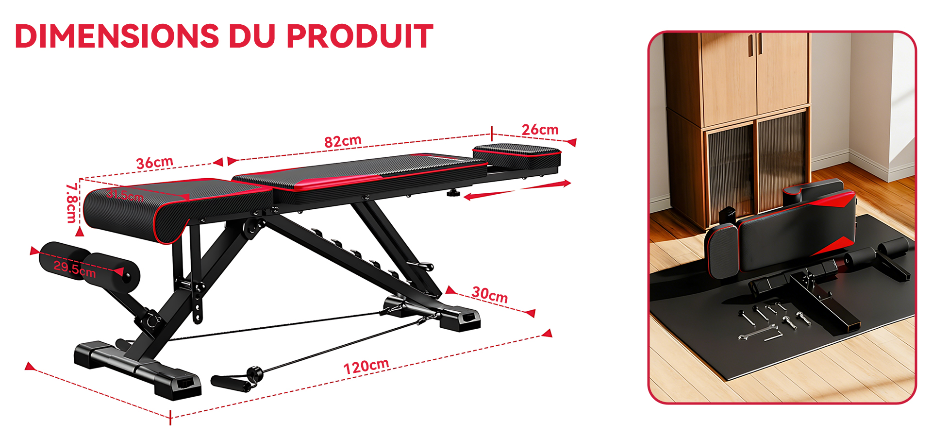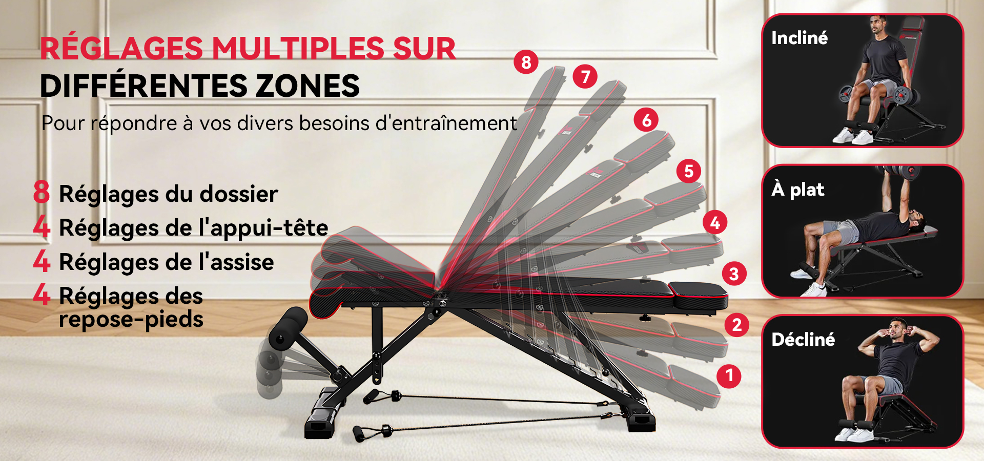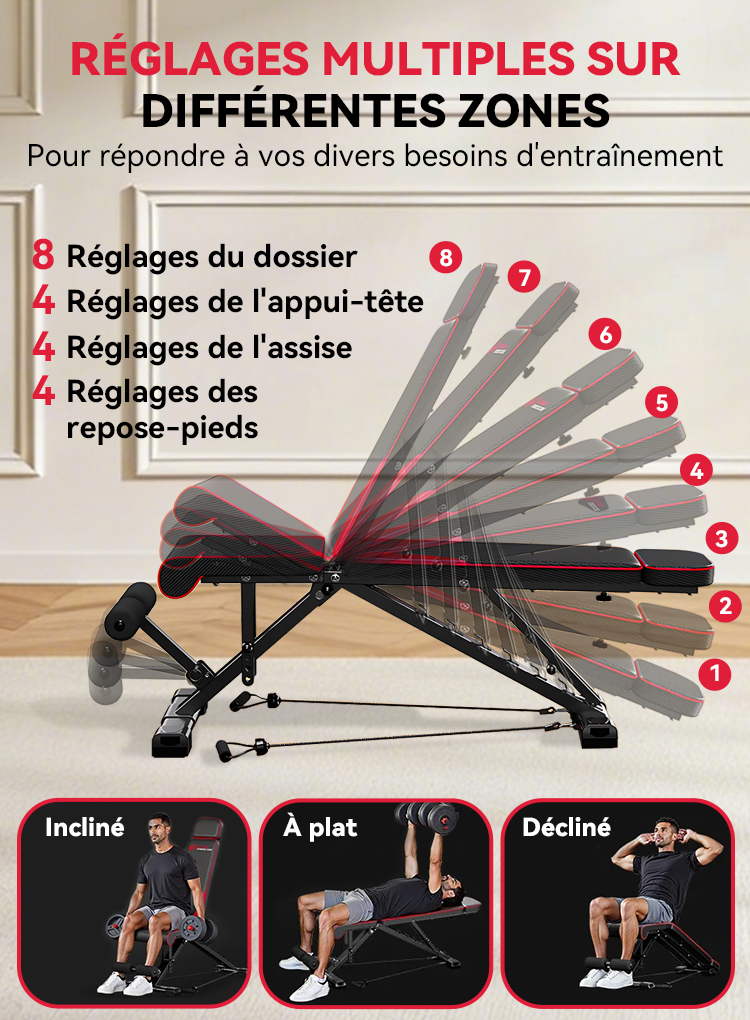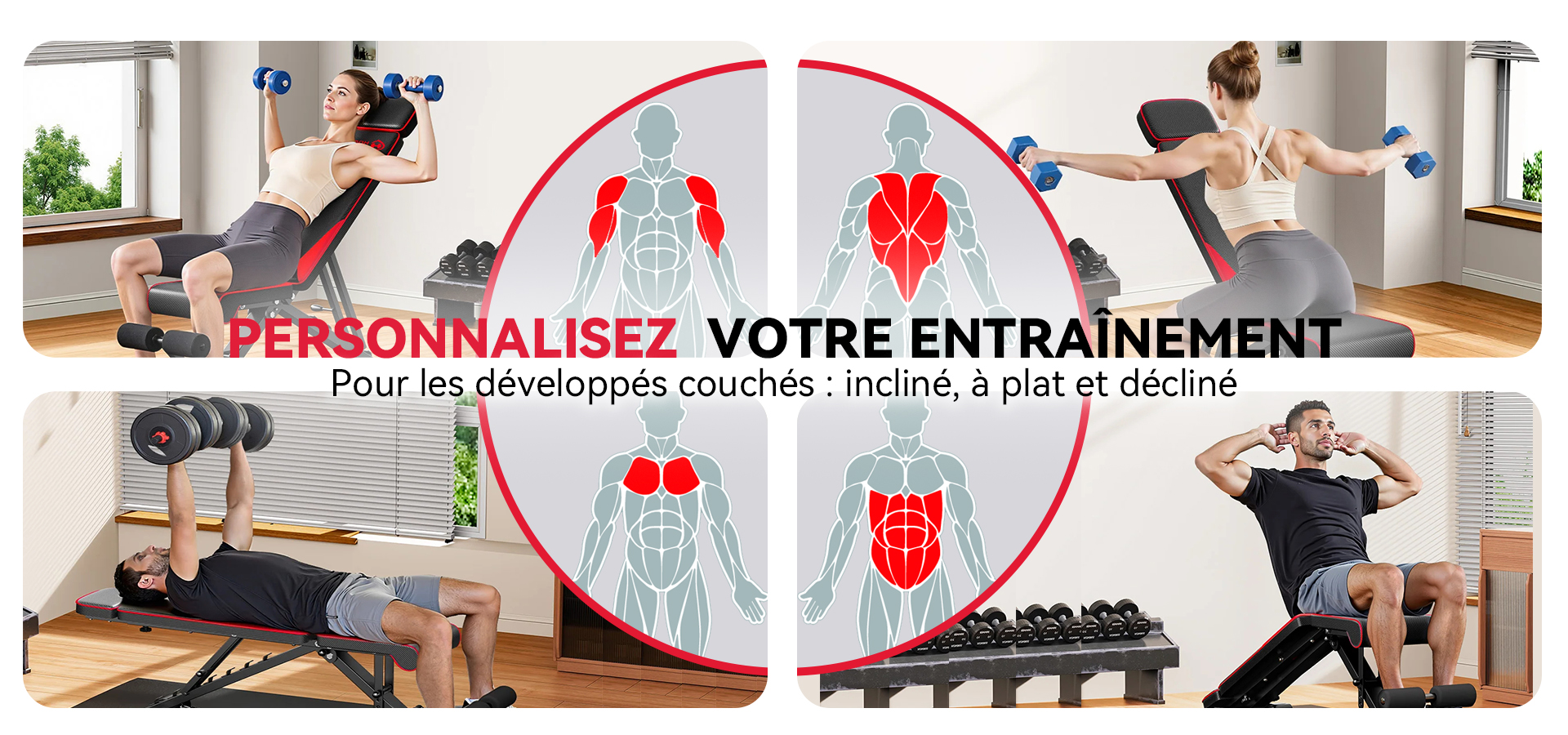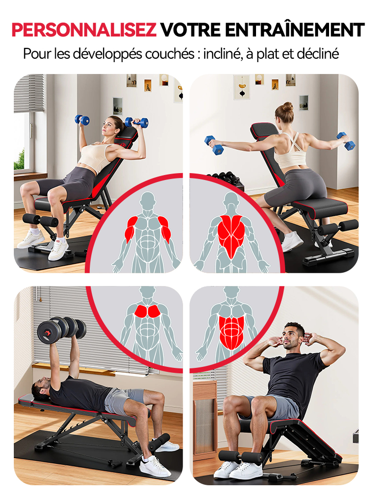 Grâce à ses multiples positions inclinées, plates et déclinées, il permet de réaliser une grande variété d’exercices, notamment le développé couché, l’entraînement avec haltères et les exercices de renforcement du tronc.