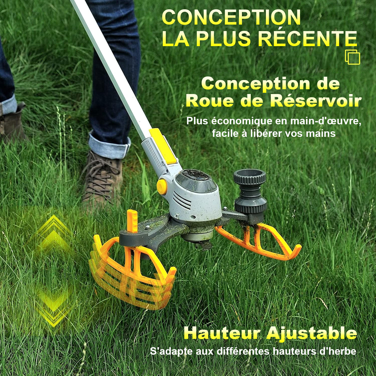 Après de nombreuses recherches et développements, Velnotra a lancé avec succès le premier modèle d'outil de pelouse sans fil 3-en-1 Débroussailleuse/Rotofil/Coupe-bordure, et a ajouté une roue de réservoir coulissante basée sur l'original, vous permettant de ne pas avoir à vous pencher pour tondre l'herbe et d'utiliser une seule main pour l'opération, facilitant ainsi le jardinage.