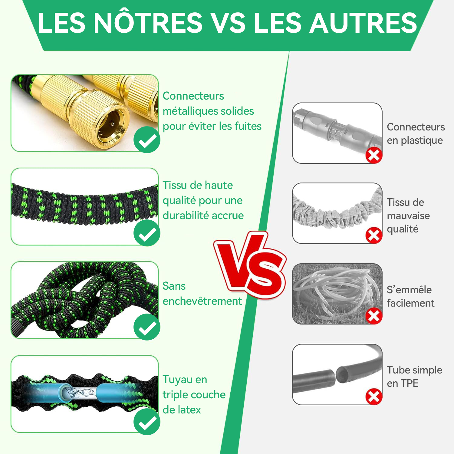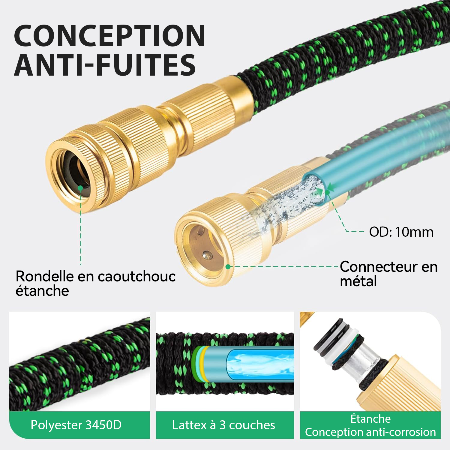 Le tuyau d'arrosage est fabriqué en matériau 3450D de haute qualité, embouts en laiton inoxydable, tuyau à triple épaisseurs de latex.ce qui peut garantir une durée de vie plus longue et une plus grande durabilité.