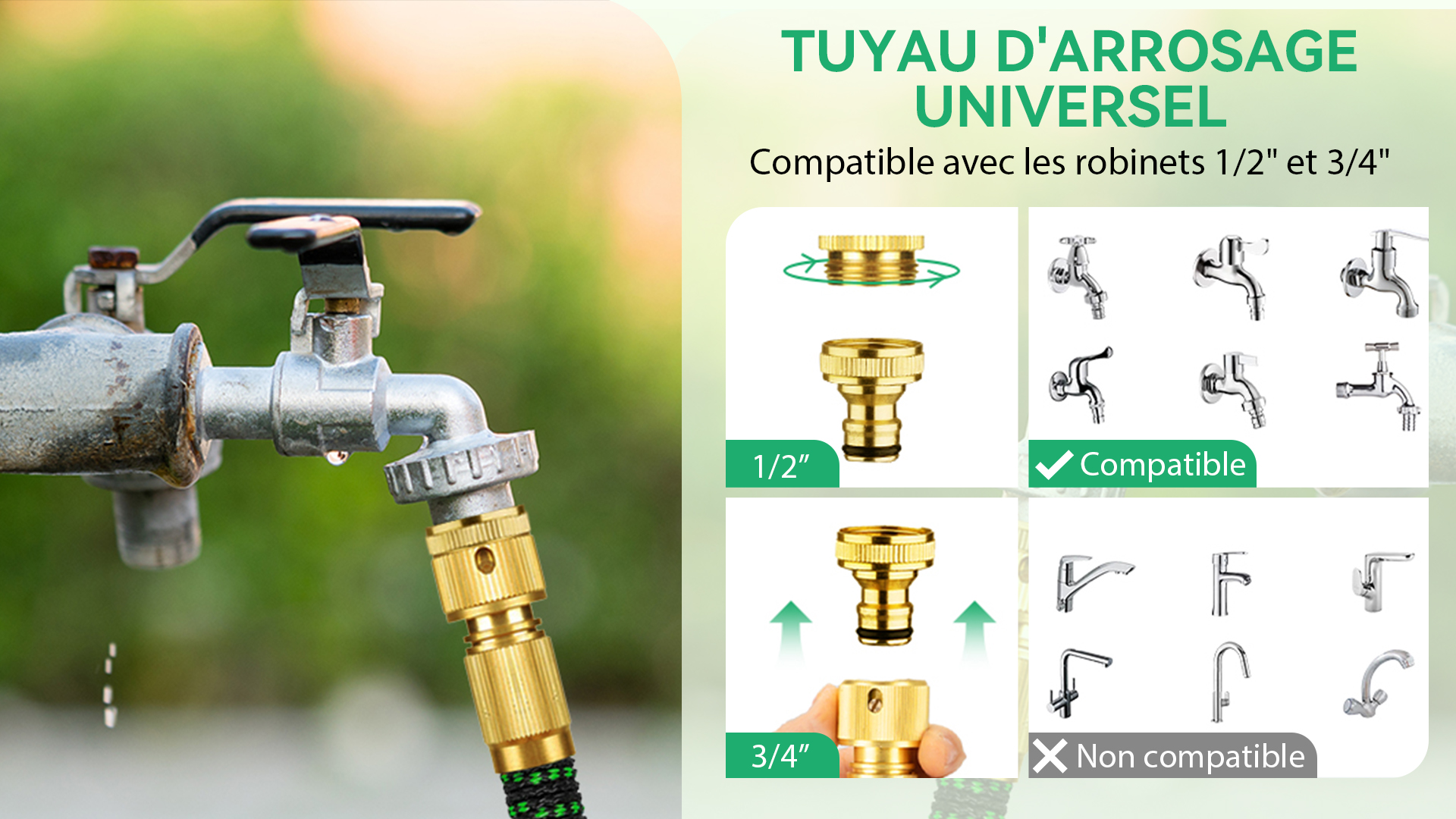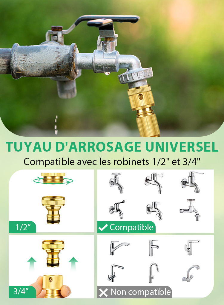 Le tuyau extensible est équipé de robustes connecteurs métalliques de 3/4" et 1/2" qui sont résistants à la rouille et étanches, garantissant une connexion fiable à tous les robinets standard. Ce tuyau de jardin de qualité supérieure est conçu pour un usage prolongé sans fissures ni fuites.