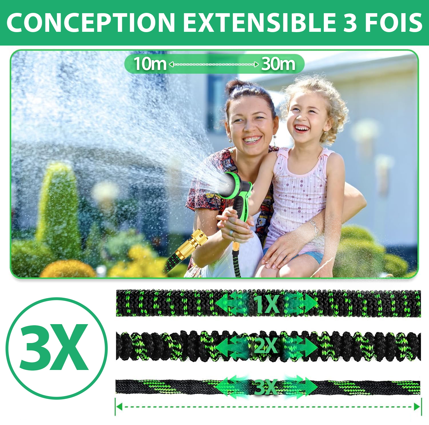 Notre tuyau rétractable de 30 mètres est équipé d’un pistolet d’arrosage amélioré à 10 fonctions, offrant plus d’options que les modèles classiques. Tournez simplement la tête pour sélectionner le jet souhaité : parfait pour le jardinage, le nettoyage, le bain des animaux ou l’entretien de votre voiture.