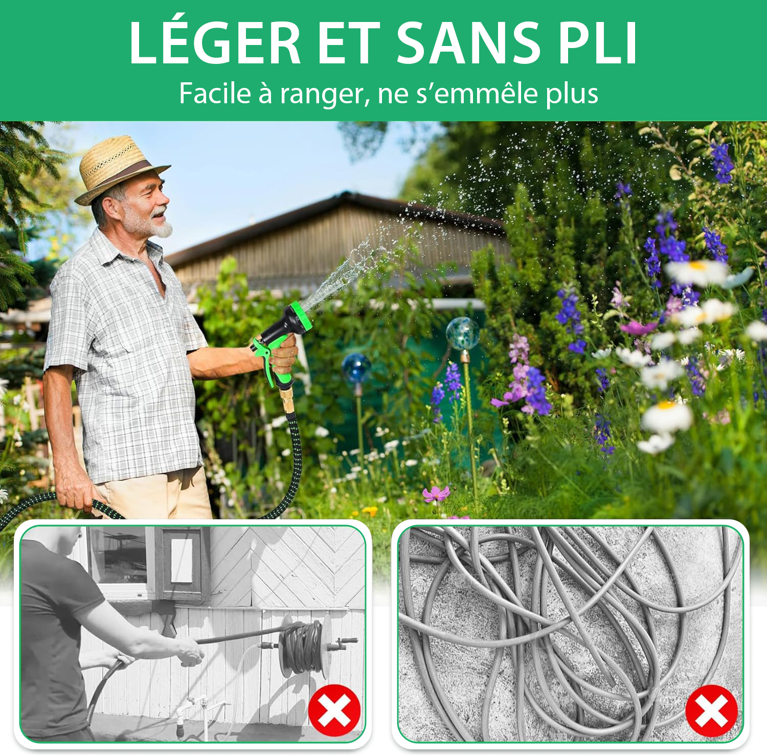 Notre tuyau d’arrosage extensible est incroyablement léger, ce qui le rend facile à transporter et à ranger. Il est fourni avec un support pratique pour le suspendre : il suffit de vidanger l’eau après usage et de le conserver dans un endroit ombragé.