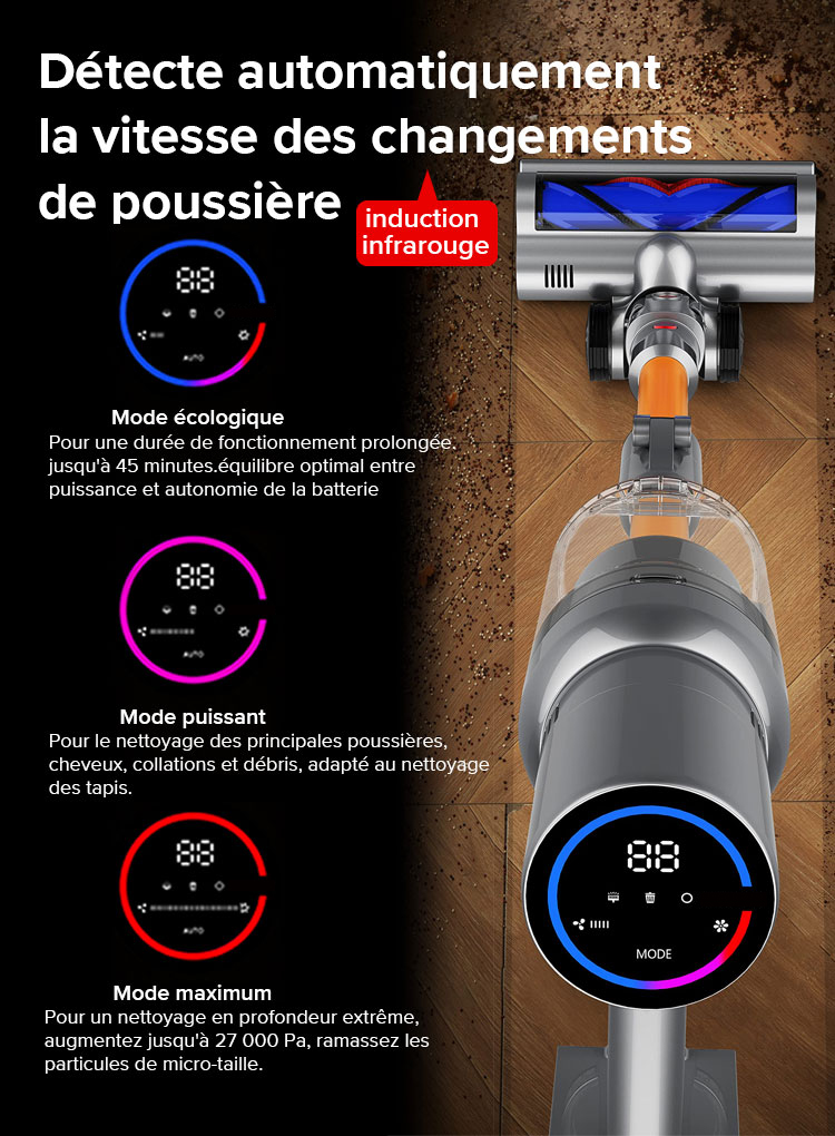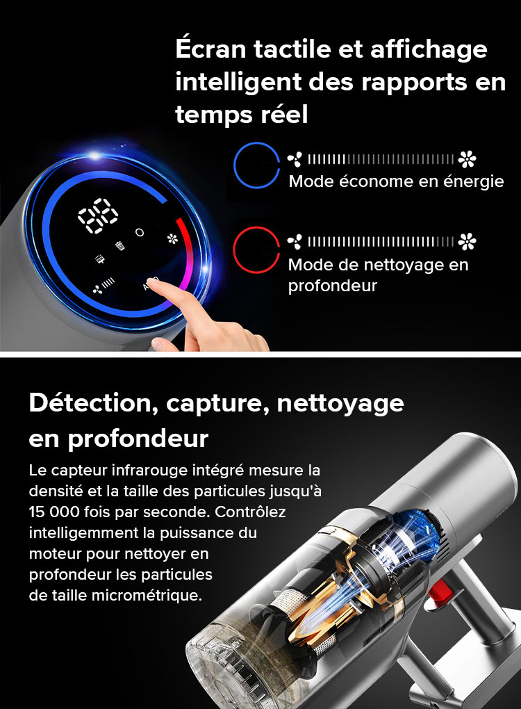 Les aspirateurs-balais sans fil sont équipés du dernier système de capteur Dust Smart, qui ajuste automatiquement la puissance d'aspiration en mode automatique en fonction de la quantité de débris et de poussière détectée pour obtenir des résultats de nettoyage optimaux tout en maximisant la durée de fonctionnement.