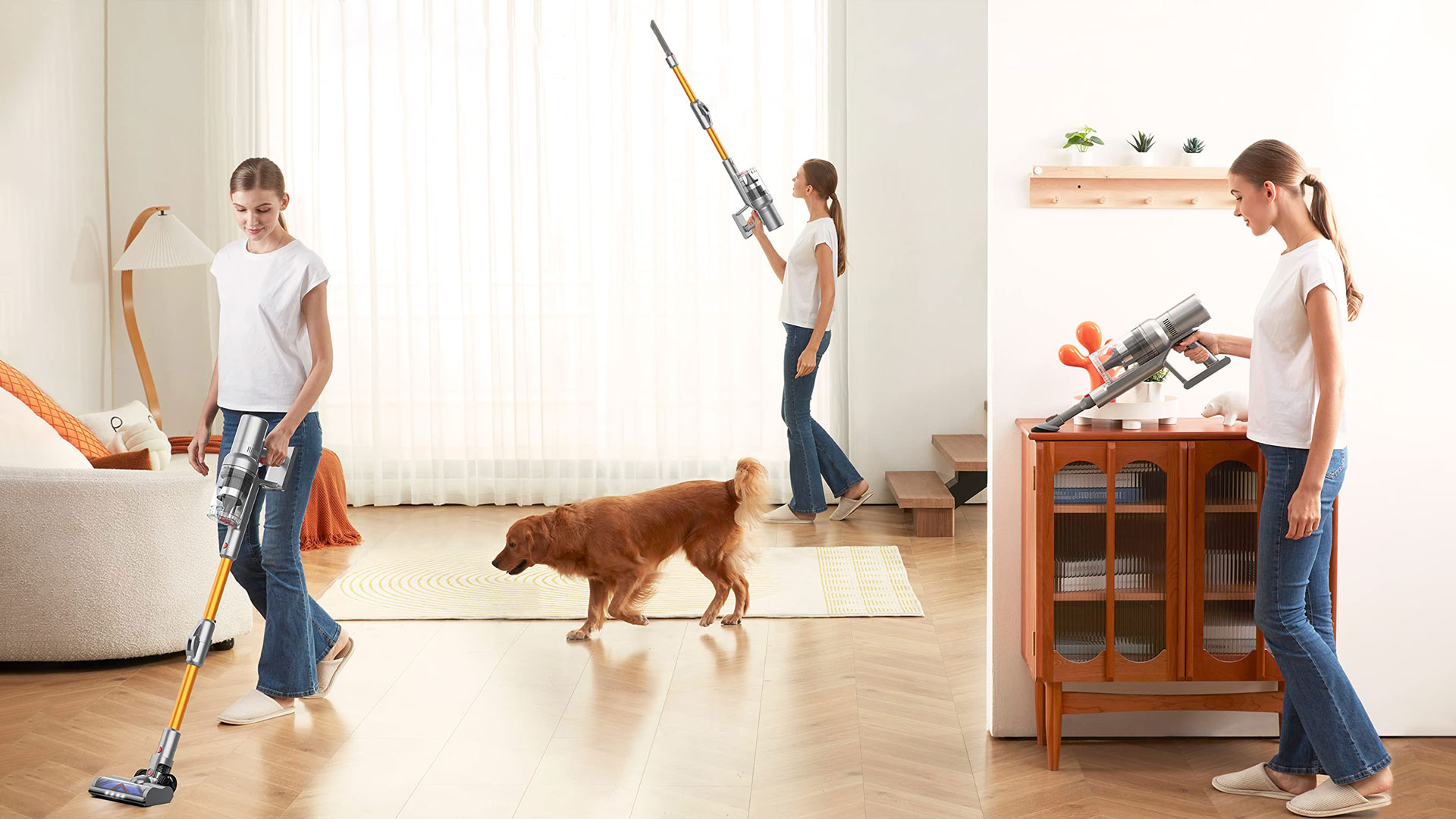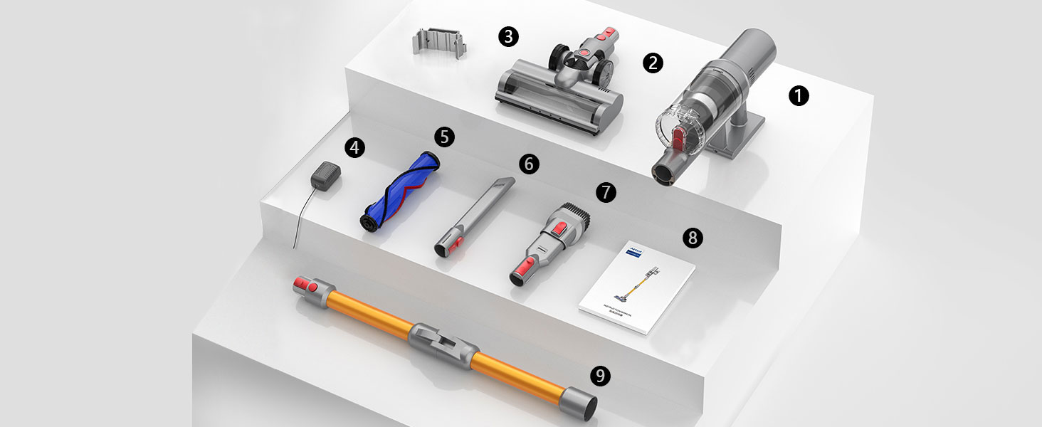 ①Moteur principal (moteur et bac à poussière) ②Brosse de sol motorisée ③Support de rangement ④Adaptateur secteur ⑤Brosse à rouleaux à poils ⑥Buse plate ⑦Brosse 2 en 1 ⑧Manuel d'utilisation ⑨Tige d'extension pliable